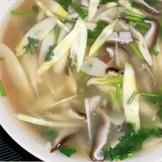 2、将竹笋、姜丝放在汤锅中加适量清水煮15分钟,再放香菇、金针煮5分钟。放精盐,味 精即可。