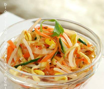 黄豆芽250克,黄瓜1根,胡萝卜1根、辣白菜250克,蒜3瓣