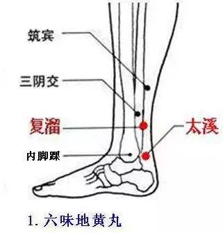 原理:小腿内侧的复溜穴(内踝尖上2指宽处,胫骨与跟腱间)是足少阴肾经上的经穴。肾经气血在此向上汇聚,刺激该处滋阴补肾效果极好。每次揉按2~3分钟,以产生酸胀感为宜,每天按揉3~5次即可相当于服用一天六味地黄丸的效果。