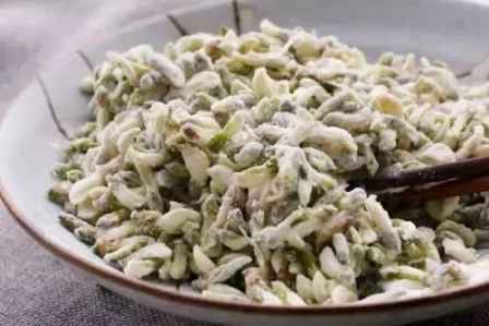 **就会将香椿裹上鸡蛋和面糊炸成条儿,香椿往往是整只,炸好后形似一条条小鱼,金**包裹着碧绿,外脆里酥,香气扑鼻。