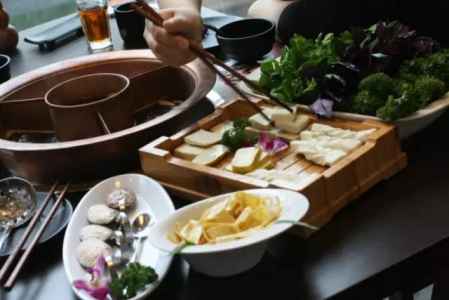 火锅首重汤头,汤汁的味道好,加什么料都好吃,素食火锅的高汤大多是用大白菜、黄豆芽、红萝卜、白萝卜、香菇或干昆布、以及芹菜叶等当季清香蔬菜来熬煮,一般还会加点玉米或甘蔗头来增添甜香味,把所有材料放入大汤锅中加水以小火熬个一小时,清淡又不失鲜甜的蔬菜高汤就完成了,可以拿来作为原味蔬菜锅的汤底。