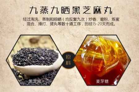将黑芝麻用水洗净,放在笼屉上蒸熟,晒干,再蒸一遍,再晒干。如此重复蒸晒九遍过后,小火炒香,放凉后打成粉,用炼好的蜜调和,拌匀后揉团、搓条,最后做成直径约2厘米的**。