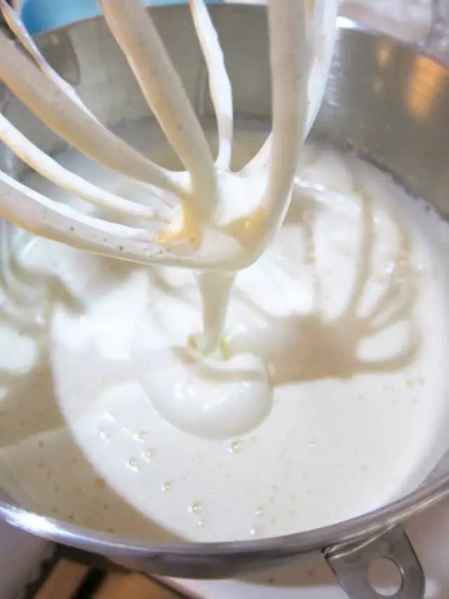 把水煮沸,将鸡蛋和白糖混合在一起搅拌直到变得蓬松,再加入盐、乳酪。