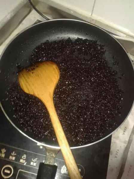 水稍微沥干,把黑米放入锅里翻炒至水分耗干,再把炒好后的黑米用料理机研磨成粉状。