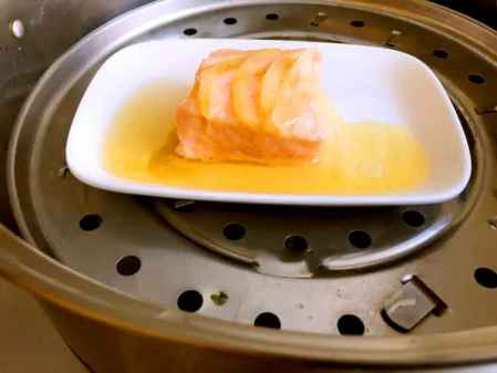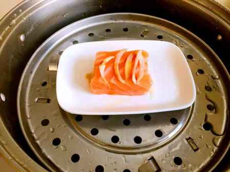 tips:给宝宝吃,不要放太多的其他调味料,三文鱼本身有咸味,只放少许盐腌制,放了两滴先抽和少许洋葱调味即可,蒸出来的三文鱼味道非常的鲜美。