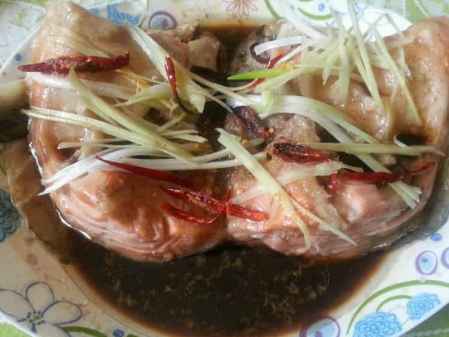 食材:三文鱼头1只,迷迭香3株,佛手瓜半个,生姜1块,蒸鱼豉油1勺,盐少许