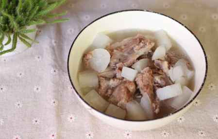 7、炖到锅内的羊蝎子已经有些脱骨的时候,(这个过程大概需要一个半到两个小时)放入切好的白萝卜一起炖。