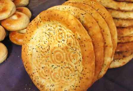 “胡麻饼样学京都,面脆油香出新炉。寄予饥馋杨大使,尝看得以辅兴无。”白居易诗中的胡麻饼就是新疆维族人民日常生活必不可少的食材之一:馕。在面粉中加少许盐水和酵面,和匀,揉透,稍发,即可烤制。添加羊油的即为油馕;用羊肉丁、孜然粉、胡椒粉、洋葱末等作料拌馅烤制的为肉馕;将芝麻与葡萄汁拌和烤制的叫芝麻馕,种类繁多,既美味又具有民族特色。