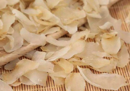 本品呈长椭圆形,长2~5cm,宽1~2cm,中部厚1.3~4mm。表面类白色、淡棕**或微带紫色,有数条纵直平行的白色维管束。顶端稍尖,基部较宽,边缘薄,微波状,略向内弯曲。质硬而脆,断面较平坦,角质样。气微,味微苦。