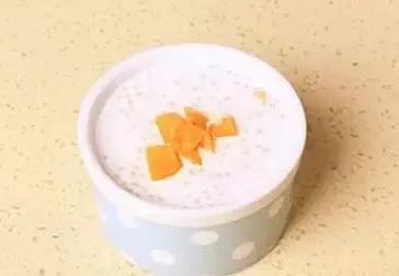 8、在容器最底层铺好西米,冰块芒果泥、芒果块,最后倒入放凉的椰浆就OK了。