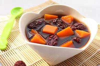 小贴士:南瓜性温味甘,可补中益气,含有丰富的胡萝卜素,经人体吸收后为维生素A,并含有丰富的维生素E,女性经期服用,可益气补血。红枣则能补脾和胃,益气生津,滋阴养血。
