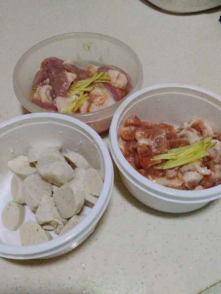 2、准备滚粥的材料,肉丸切厚片,瘦肉切薄片、猪粉肠切段,瘦肉和猪粉肠各加入少许糖、盐、生抽、广东米酒、生粉、油、姜丝搅拌均匀腌制。
