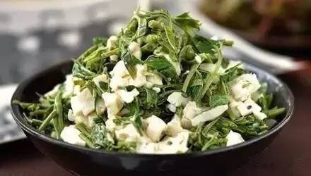 内容:香椿食疗方,香椿芽拌豆腐,将香椿芽采摘后在水里焯一分钟,捞出切细丁将豆腐切成小块,两者调拌起来,放上适当调味品就可以吃了。