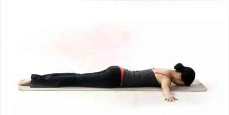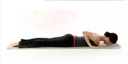 准备动作:身体正直地趴在垫子上,双腿伸直互相稍稍贴近,额头压在垫子上,两个手向身体两侧伸直展开,手心贴着地板,形成准备动作。