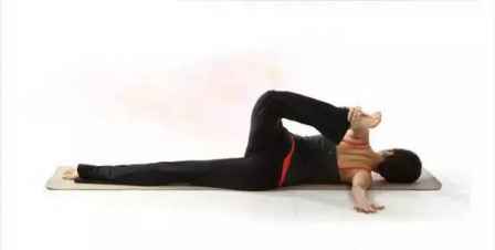 呼气的同时,抬起的左脚踝越过右侧,左胸和盆骨向着左边竖起来。这个时候右手和右脚都保持原来的姿势不动,为了使得右脚能继续保持伸直的状态,头部稍稍向左边转过去,右耳朵贴着垫子。