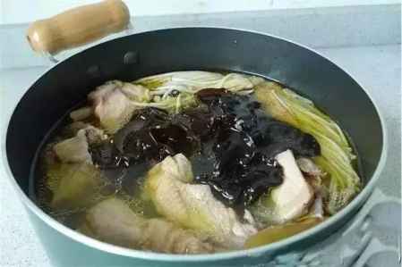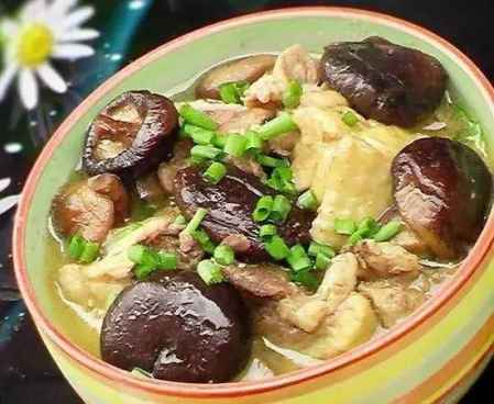 4. 煮沸清水,放鸡、香菇和姜片,武火煮20分钟,转小火煲一个小时,再放入金针菜和木耳煲半小时,撒入葱粒,接着下盐调味即可食用。