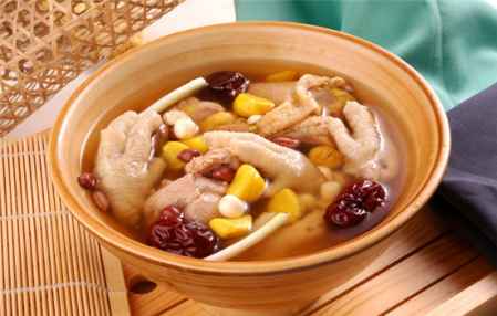 做法:鸡脚100克、扁豆10克、苡仁10克、云苓6克、生姜1片。将鸡脚去衣洗净飞水,再与洗净的药材一起放进炖盅内,加清水300毫升,隔水炖2小时调味后服用。