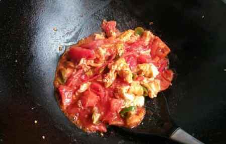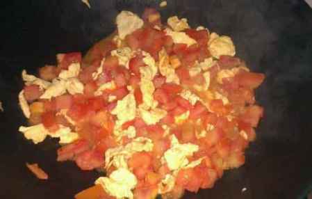 9、炒到蛋半熟时,倒入番茄,再次混合炒匀。