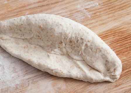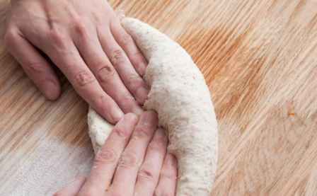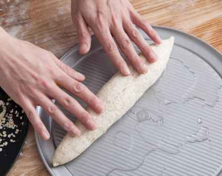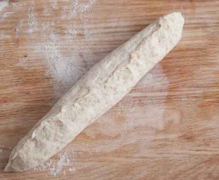 3.用手按住面团往前推使面团表面上筋有硬度,整形成长条