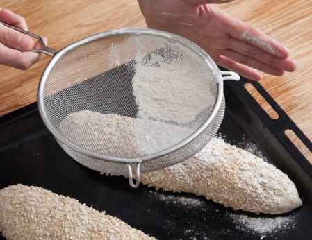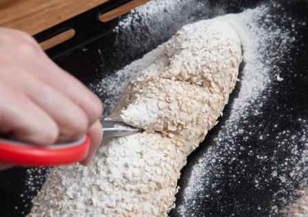 6.撒上干粉,用锋利的刀在面包上轻轻划三刀或者轻轻剪三刀