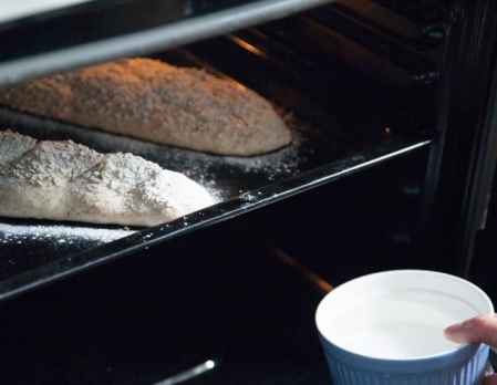 7.烤箱预热225℃,放入面包,在下层再放一碗水,烤20-25分钟。没有烤碗,也可以在下一层烤架放一个空的烤盘,装上水。