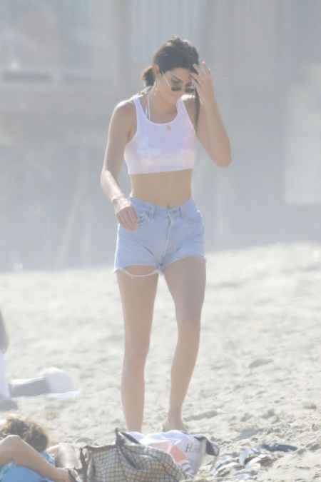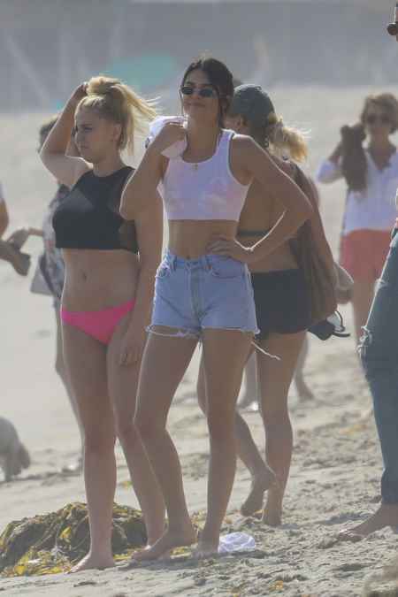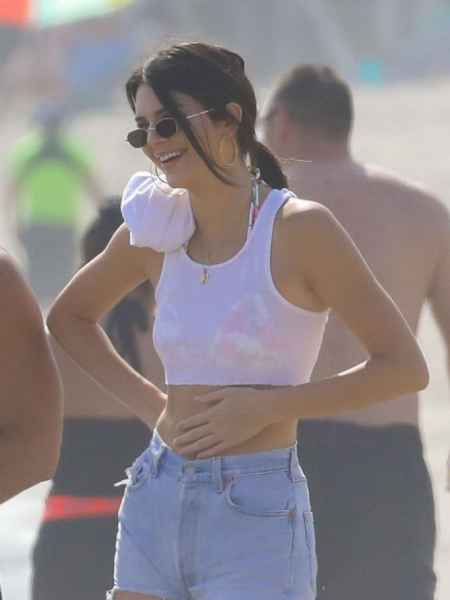 Kendall Jenner白色露脐上衣+牛仔热裤沙滩玩耍 迷你墨镜逗趣十足