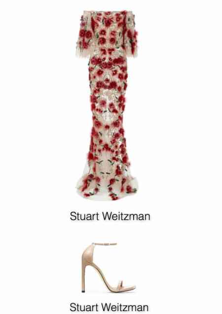 LOOK 1:Stuart Weitzman一字肩花朵礼服+Stuart Weitzman一字带高跟