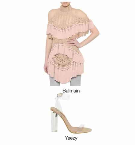 LOOK 2:Balmain粉色流苏裙+Yeezy高跟鞋