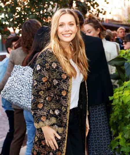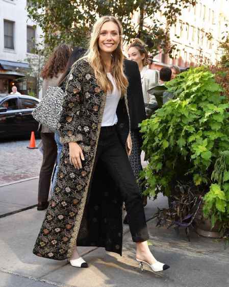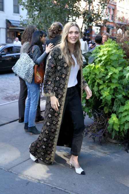 伊丽莎白·奥尔森出席活动街拍 黑色绣花长外套+无跟拖鞋惊艳镜头