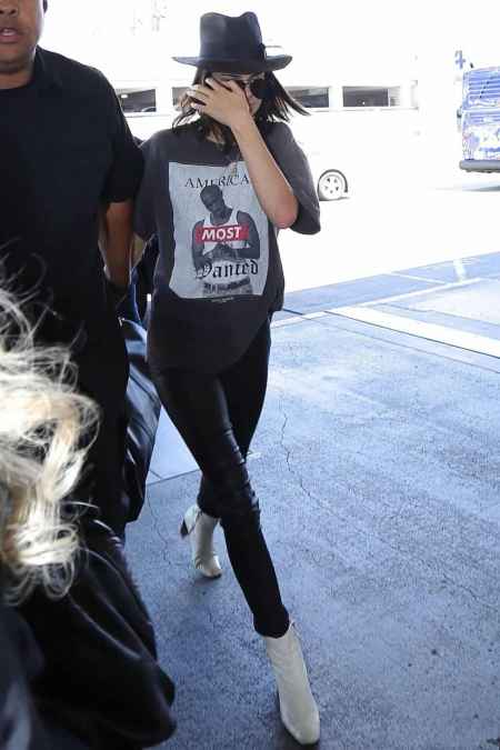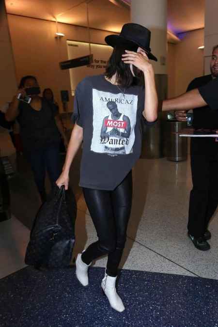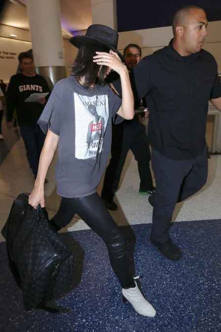 Kendall Jenner 现身洛杉矶机场 黑T+皮裤一如既往的帅