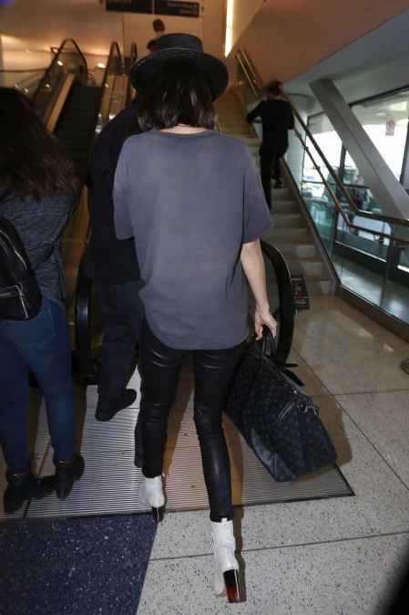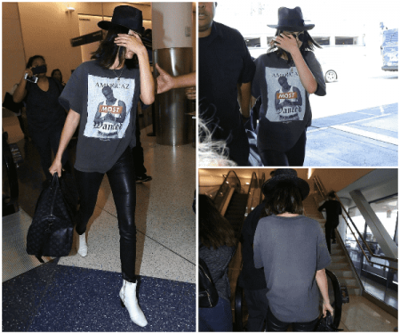 肯豆Kendall Jenner 现身洛杉矶国际机场,黑色文化T+九分皮裤,又酷又性感,野性十足。巴拿马帽、袜靴点缀细节,up吸睛度和时髦感。