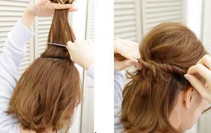 step2:从耳朵两边各取出一束头发,扭转成发辫后在脑后重合固定。