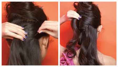 步骤3:将头顶的头发放下来,联合下面的头发,一起向里面窝。窝好后,在头发里面**U形夹,让这个形状保持好。把发带从下面缠绕上来,在头顶打好一个俏皮的结,一个简单发型就做好了!