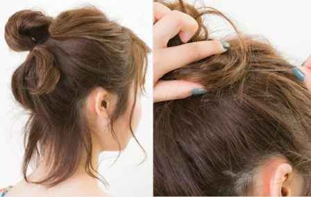 step 1:头发集中到一起用橡皮筋扎起来,对折半扎成简单发髻。