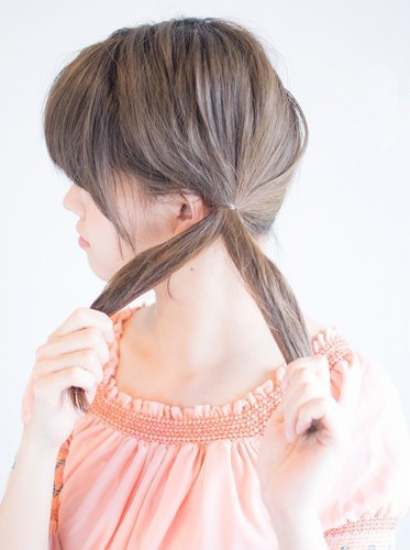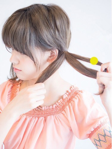 接着将头发在两侧耳后的位置用橡皮筋扎成两马尾,注意扎的时候不要太紧要尽量放松,然后再将一侧的马尾平均分两份。