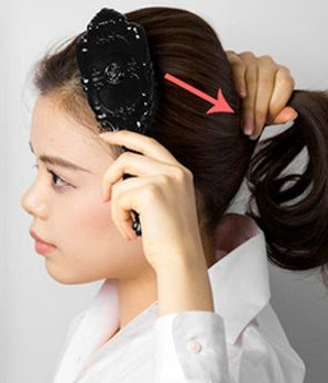 第三步:一束握紧马尾,一手拿宽发梳将头发梳向马尾,让头型更加有纹理更加紧实一些。
