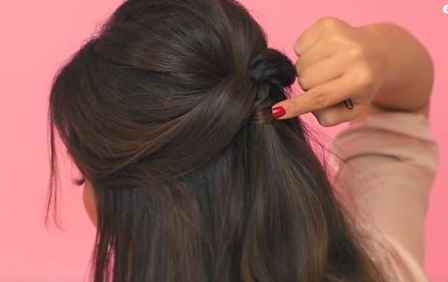 Step 4:从下半部分拿起一小束头发,把这束头发缠绕在橡皮筋的外围遮住橡皮筋的痕迹,最后用发夹固定。