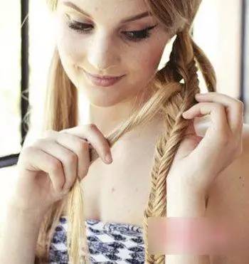 第五步:剩余的部分沿着鱼骨辫缠绕起来,不时的穿过鱼骨辫,直至发梢,而右边的马尾辫进行同样的编发步骤。