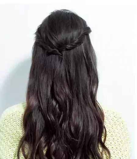 step3:再从右侧也取出一只发辫扭转后与左侧的发辫一起在脑后重合固定即可。
