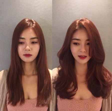 上图左边的图片是红棕色的直发,看起来有点普通。右图弄了一个**浪C型卷,而且还弄了一个偏分的齐嘴刘海,超显脸小,而且显女神范。