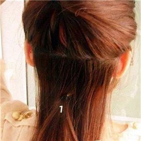 step 1:将飘逸的发丝梳理平整后先将上半部分发型用发夹固定,从下半部分的最下面取出少量的发丝扎成马尾。