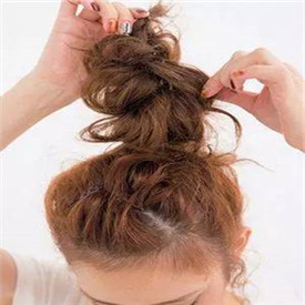 step 4:将最后的马尾辫盘成花苞头发型,将上半部分的发丝散落开来分为左右对等的两个部分。