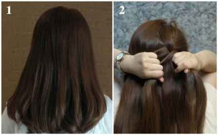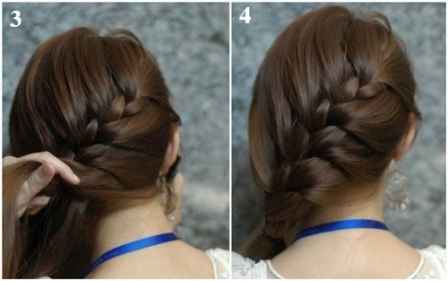 Step 2:从右耳侧取一束头发,分成三股,编成三股辫,往左下角编下去。