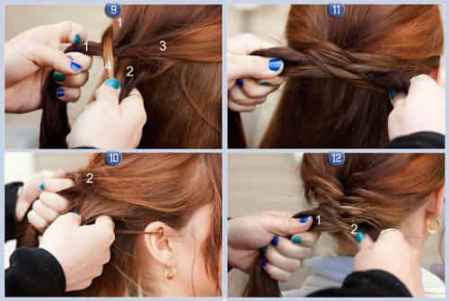 13-14、接下来,又是剩下两股头发,就跟刚开始一样从两股的外侧取一小束头发交叉汇入到另一股,反复编完,最后剩一点点,用皮筋把发尾扎起来就OK了。
