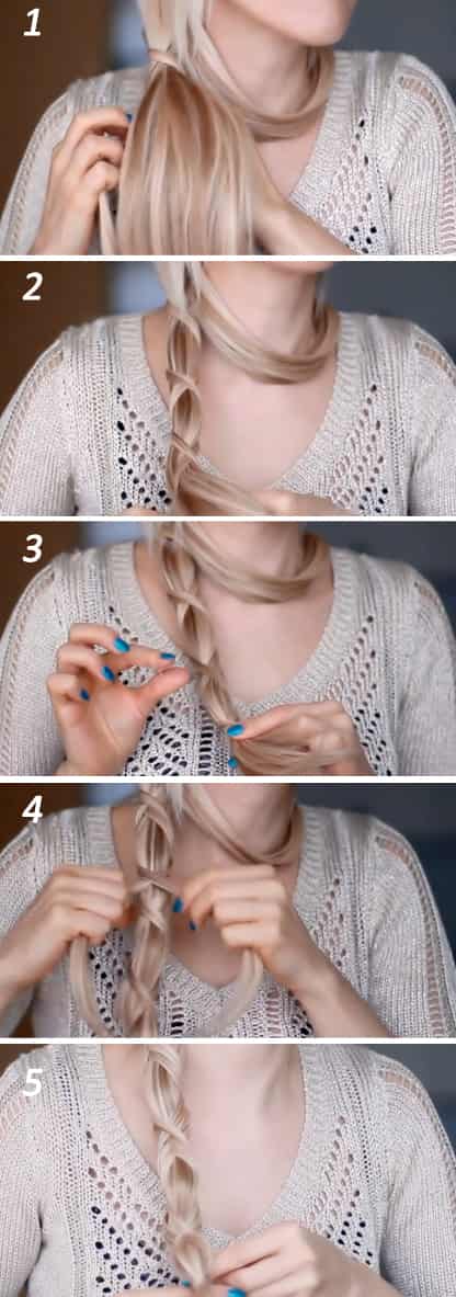 第三步:图中交叉缠绕三次就差不多了,这步需要根据你头发的长度来决定缠绕的次数。到达马尾发梢时,先用发夹或者皮筋扎起来,不要让缠绕的头发松掉。