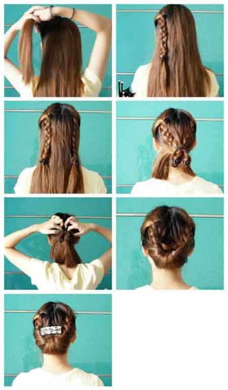 步骤3-4:右侧的发束按照步骤1来进行。两侧都扎好三股辫后,将包括辫子的所有头发全部扎起来,用橡皮对折固定住。