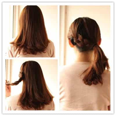 STEP 1:这款发型不仅适合直发MM,同样也让卷发美眉爱不释手,我们首先将头发理顺,从左边拿起一大缕头发,一般是五分之一的发迹量,将这缕头发编成一个马尾,用小皮筋固定好,再把麻花辫和剩余的头发放在右边,扎在一起。
