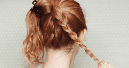 第二步:接着将马尾分别两部分,一边用黑色大发夹固定住,另一部分编织成三股麻花辫,至发尾并用橡皮筋扎好。