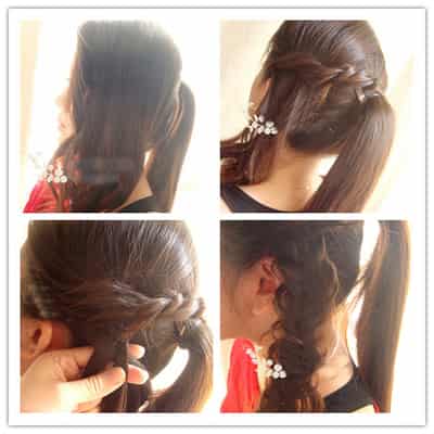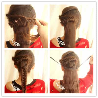 step2:从中间开始烫就好了,接着就开始编发,取出左耳上方两股头发,将其对扭之后沿着扎好的马尾绕一圈固定,把剩下的头发编成一个麻花辫。