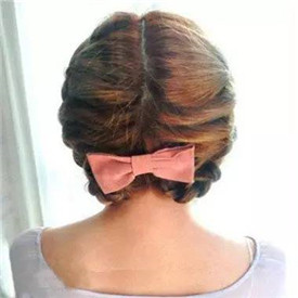 两个小巧的发髻直接盘在略低一些的位置,将头发蓬松的编成两边都盘起来的效果,蝎子辫一样的造型,不管是多短的头发,都能被精准的打理出来,低盘发发型用发夹固定,发饰固定在两个编盘发之间。